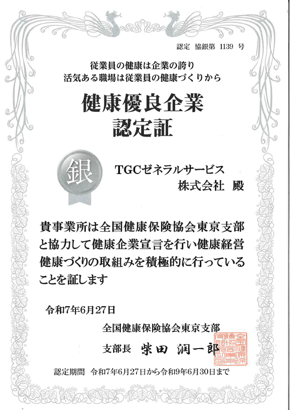 健康企業宣言を行い健康経営健康づくりの取組みを積極的に行っている企業として、健康保険組合連合会(東京連合会)より、2025年6月27日付けで健康優良企業に認定され「銀の認定」を取得いたしました。
